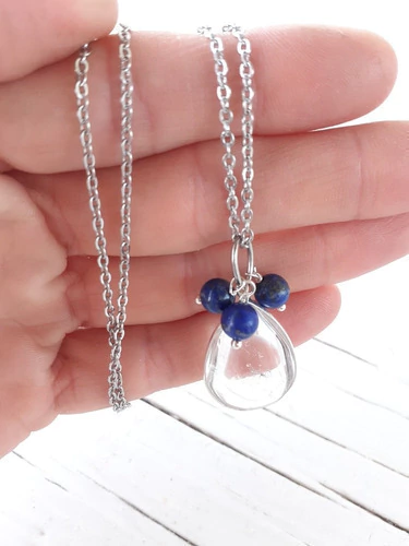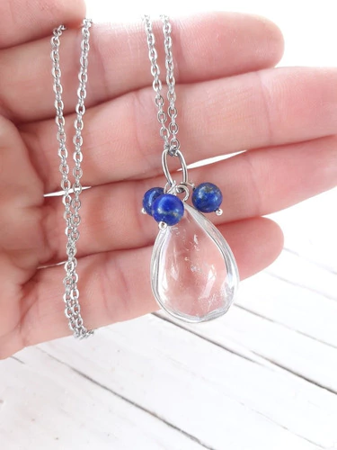 Dije con gota de cuarzo cristal y metal bronce con baño de plata de 3cm aprox, cuentitas de lapislázuli de 4mm.